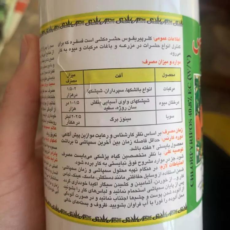 حشره کشی فسفره برای کنترل انواع حشرات در مزرعه وباغات مرکبات وسایر میوه ها به کار میرود