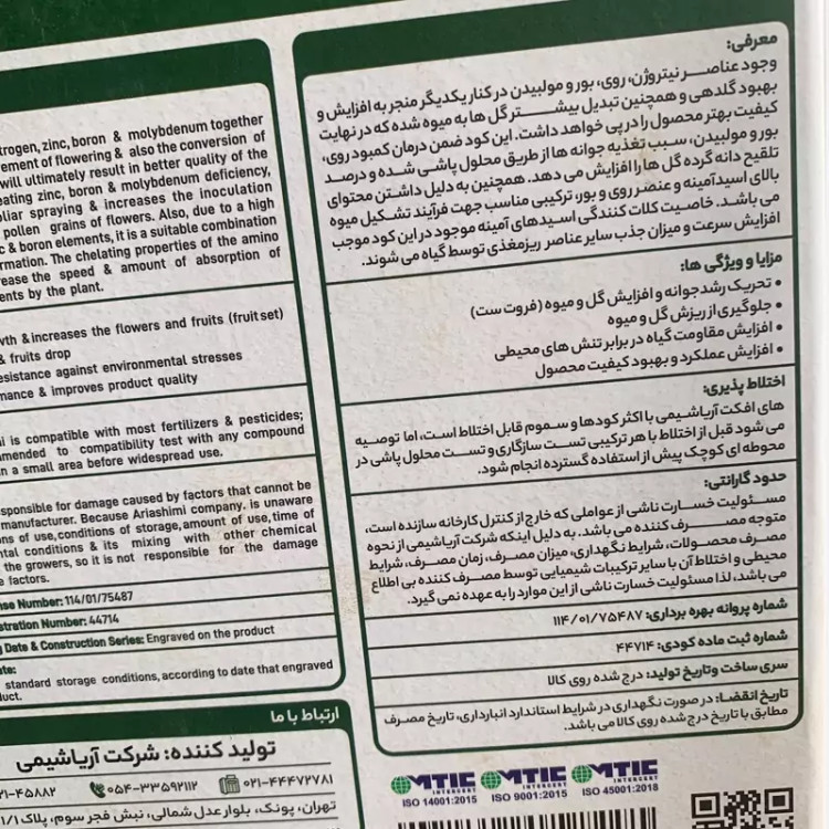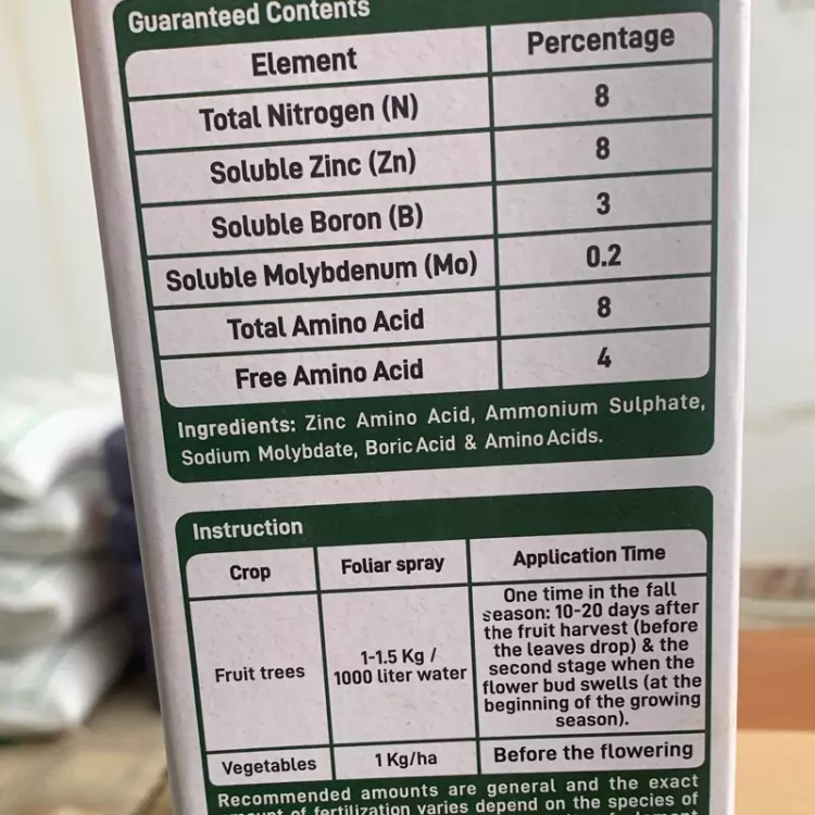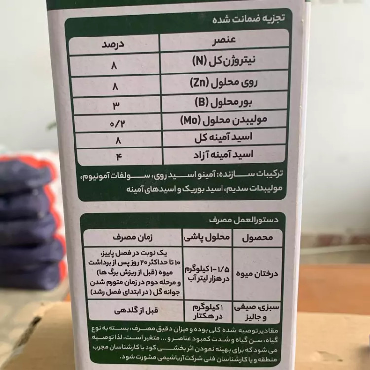 افزایش گلدهی میوه دهی در مزارع سبزی صیفی جالیز وباغات ترکیبات سازنده:آمینو اسید،روی،سولفات آمونیوم،مولیبدات سدیم،اسید بوریم وجود عناصر نیتروژن،روی ،بور،مولیبدن درکنار یک دیگر معجزه ای برای کلدهی میوه دهی بیشتر گیاهان