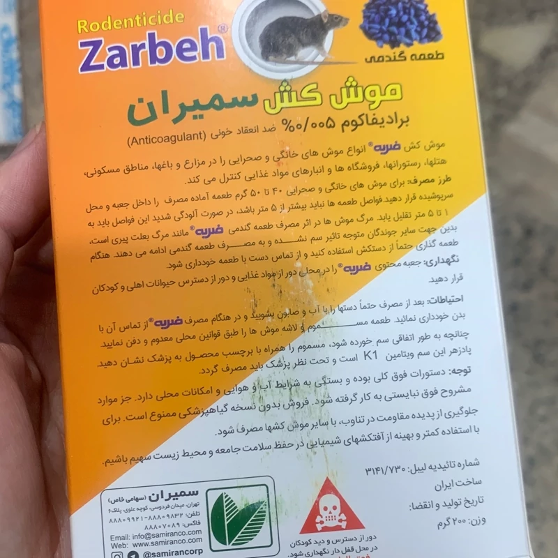 موش کش گندمی ضربه قادر به نابودی موش های ورامین(موشهای کوچک)، مغان و انباری می باشد. میزان مصرف 20 الی 50 گرم کنار لانه موش یا جایی که برای تغذیه موش مناسب است. ماده موثره موجود در “ضربه®”،0/005گرم بروديفاکوم در هر کیلوگرم است که متعلق به نسل دوم مواد ضد انعقاد خونی بوده است.
