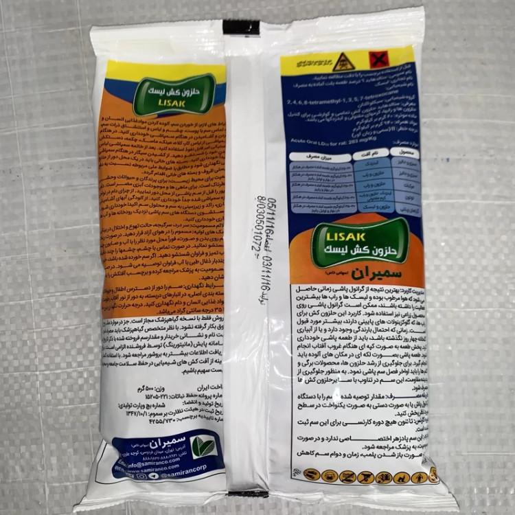 جهت مبارزه با انواع راب،حلزون ،کرم های مفتولی وآبدزدک ها حلزون کش "لیسک®" سمیران حاوی متالدهاید 6 درصد، حلزون کشی تماسی و گوارشی است که به صورت پلت های کوچک استوانه ای(طعمه آماده مصرف) تهیه و جهت مبارزه با کرم های مفتولی، حلزون ها و راب ها در مرکبات، توتون، سبزی و صیفی، جالیز و اشجار جنگلی و باغی به کار برده می شود.