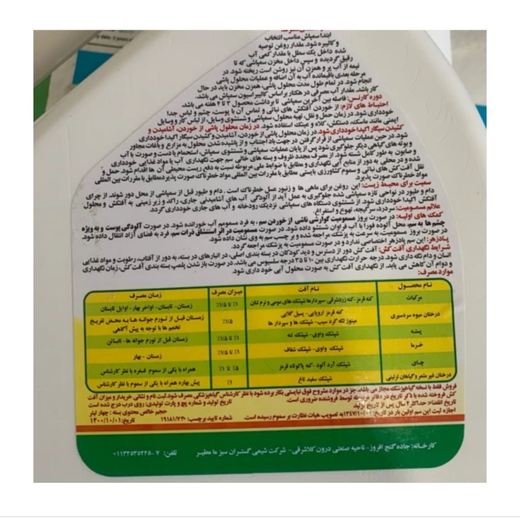 مواد خطرناک صورت پذیرد. سمیت برای محیط زیست این روغن برای ماهیها و زنبور عسل خطرناک است. دام و طیور قبل از سمپاشی از محل دور شوند. از چرای دام و طیور در نواحی تازه سمپاشی شده جلوگیری به عمل آید از آلودگی آبهای آشامیدنی جاری راکد و زیر زمینی به آفتکش و محلول آفتکش اکیدا خودداری شود از شستشوی دستگاههای سمپاشی نزدیک رودخانه و آبهای جاری خودداری گردد.