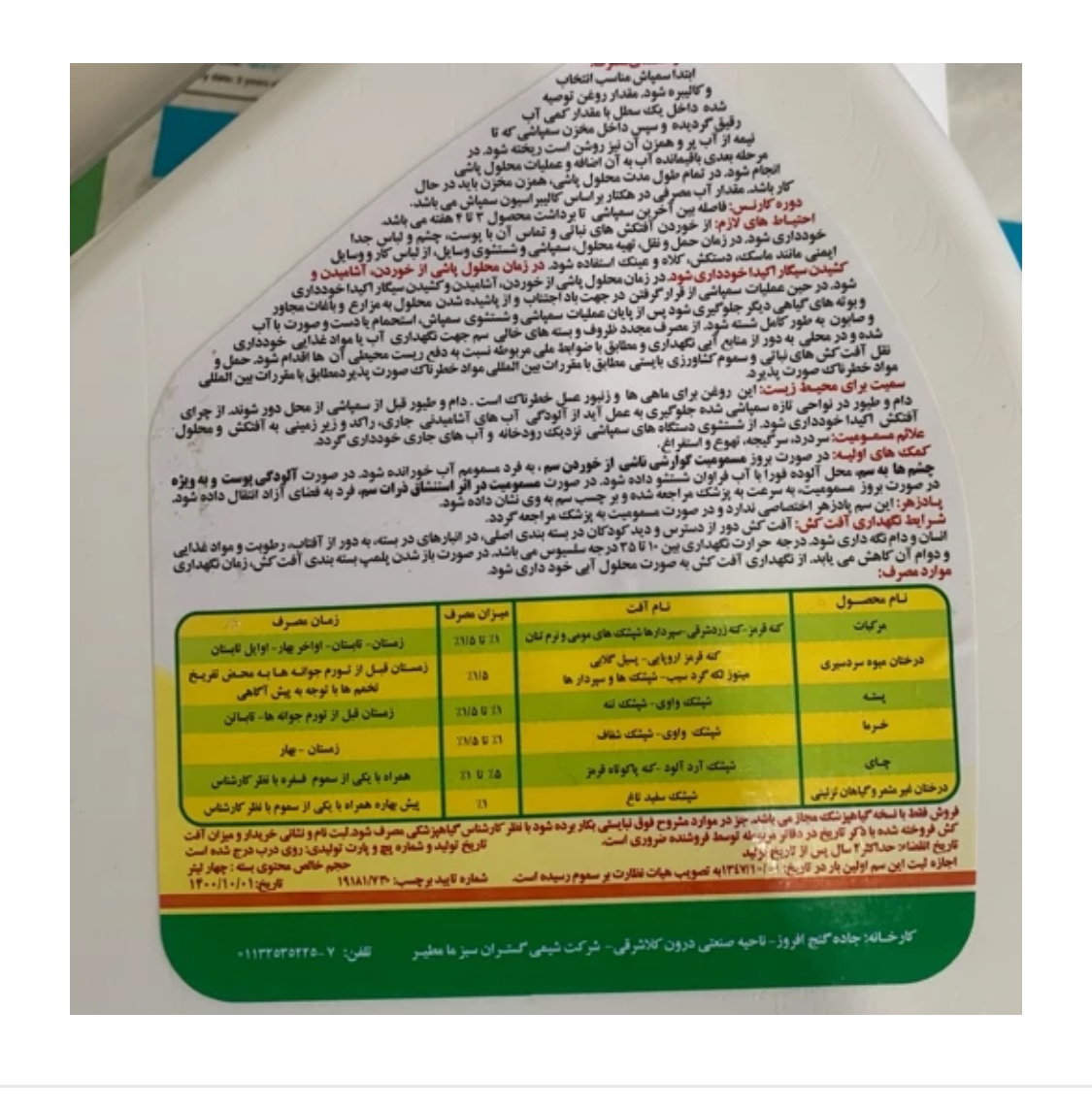 شرایط نگهداری آفت کش آفت کش دور از دسترس و دید کودکان در بسته بندی اصلی در انبارهای در بسته به دور از آفتاب، رطوبت و مواد غذایی انسان و دام نگه داری شود. درجه حرارت نگهداری بین 10 تا 35 درجه سلسیوس می باشد. در صورت باز شدن پلمپ بسته بندی آفت کش زمان نگهداری و دوام آن کاهش می یابد. از نگهداری آفت کش به صورت محلول خودداری شود