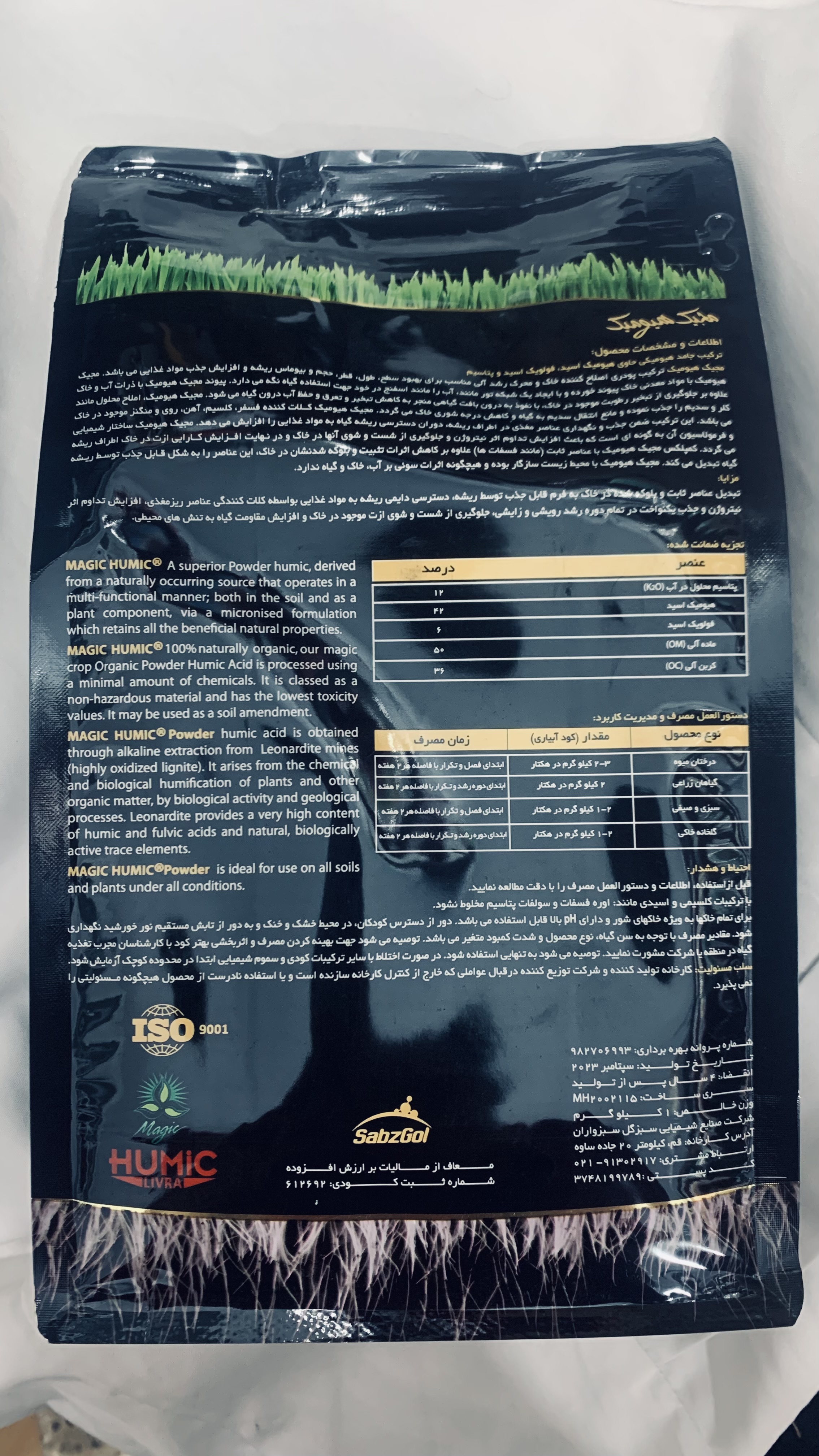 کود هیومیک مجیک حاوی میزان زیادی هیومیک اسید و فولویک اسید بوده که هیومیک موجود در آن موجب بهبود ساختمان فیزیکی و شیمیایی خاک می گردد فولویک نیز علاوه بر تاثیر بر سلول های گیاهی به عنوان کلات طبیعی عمل کرده و موجب افزایش جذب عناصر غذایی توسط ریشه میگردد.