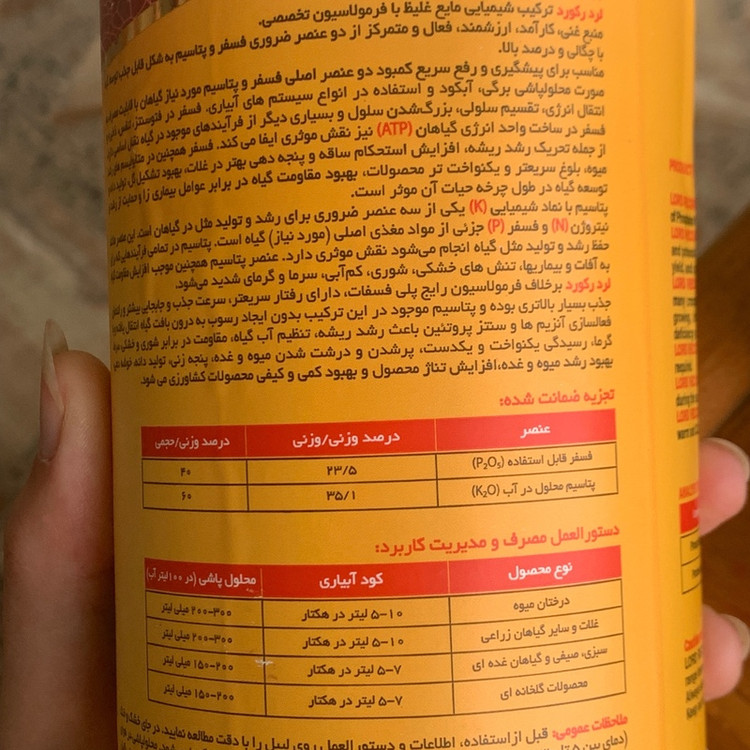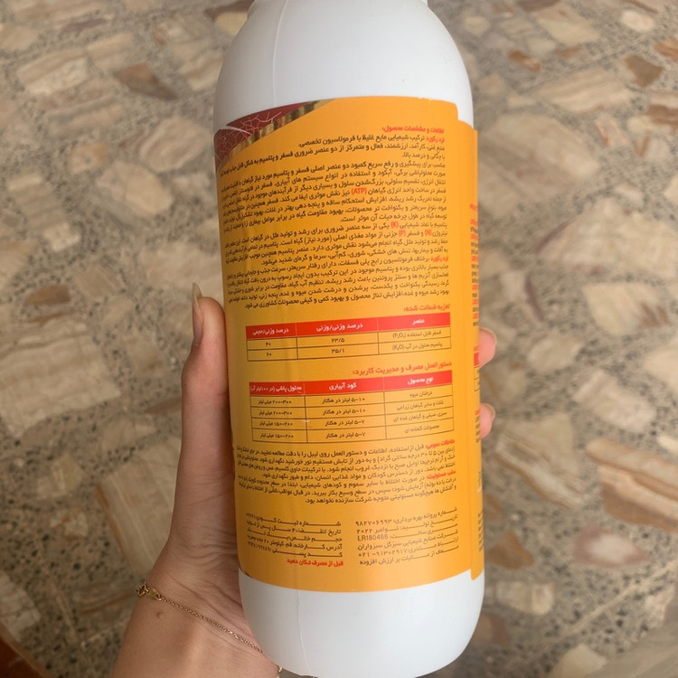 ترکیب شیمیایی مایع غلیظ با فرمولاسیون تخصصی رفع سریع کمبود دو عنصر فسفر وپتاسیم باقابلیت مصرف به صورت محلول پاشی برگی،آبکود ،استفاده در انواع سیستم های آبیاری 0-40-60 N-P-K