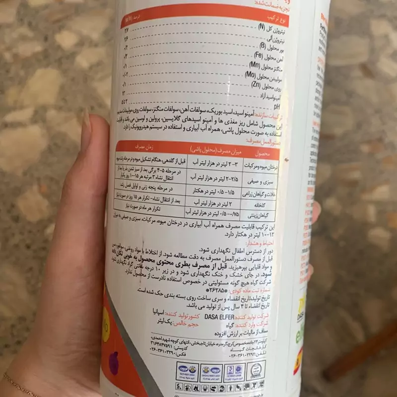 حاوی آمینواسید ،اسید بوریک،سولفات آهن ومنگنزو روی،مولیبدات سدیم و ریزمغذی ها قابل استفاده به صورت محلول پاشی ،آب آبیاری ودر سیستم ها ی هیدرو پونیک برای تقویت گیاه ،جلوگیری ورفع انواع تنش های محیطی