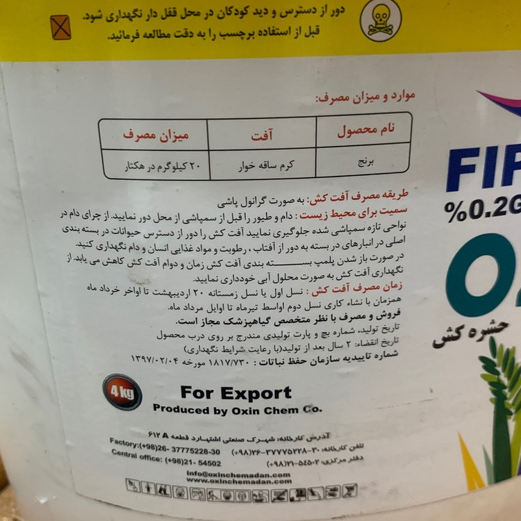 حشره کش فیبرونیل دودهم درصد اکسین شیمی 4کیلویی کرم ساقه خوار برنج