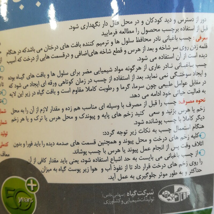قبل از مصرف چسب را با وسیله ای مناسب هم زده ومقدار لازم از آن را در محل زخم یا هرس بزنید وسعی کنید زخم های پایه پیوندک ومحل هرس یاترک ویا هر زخم دیگر کاملا باچسب پوشانده شود.