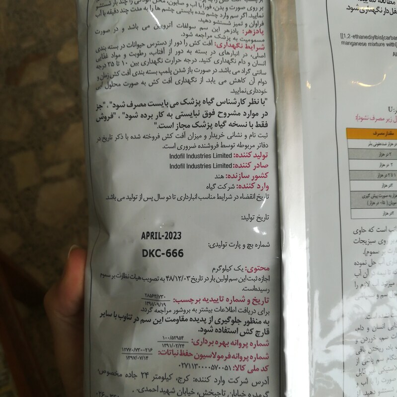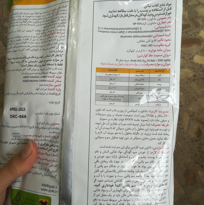 نحوه ومیزان مصرف:به طور معمول 40 گرم از قارچکش را در 20 لیتر آب حل کرده وگیاه را سم پاشی میکنند